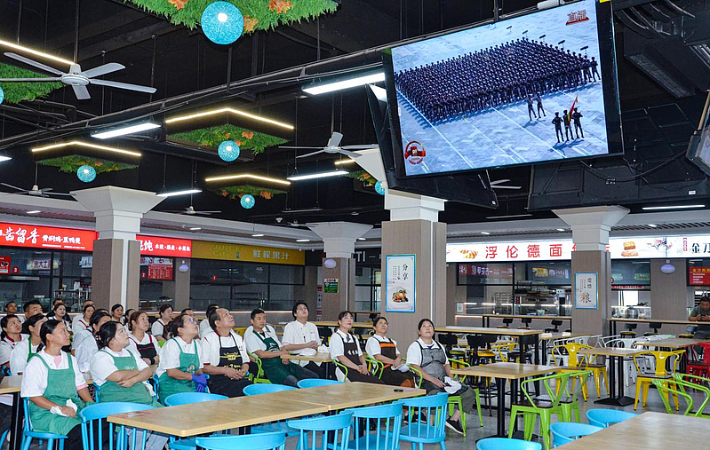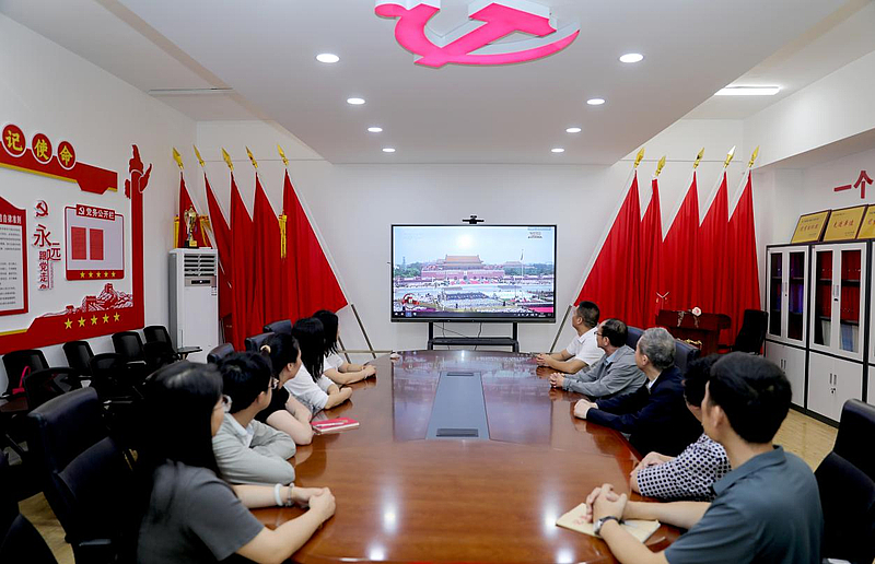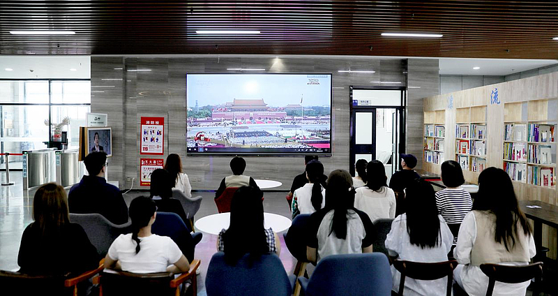当激昂的国歌响起,全体师生自发起立,齐声高唱国歌,声音响彻校园的每一个角落。在阅兵式过程中,受阅部队整齐划一的步伐、威武雄壮的军姿、先进精良的装备,让师生们目不暇接,赞叹不已。从教学楼的阶梯教室到校务楼会议室,从文体中心到餐厅的公共观影区,原本的喧嚣被庄重取代,每一个专注的身影,都让校园变成了一堂生动而厚重的爱国主义实景课。